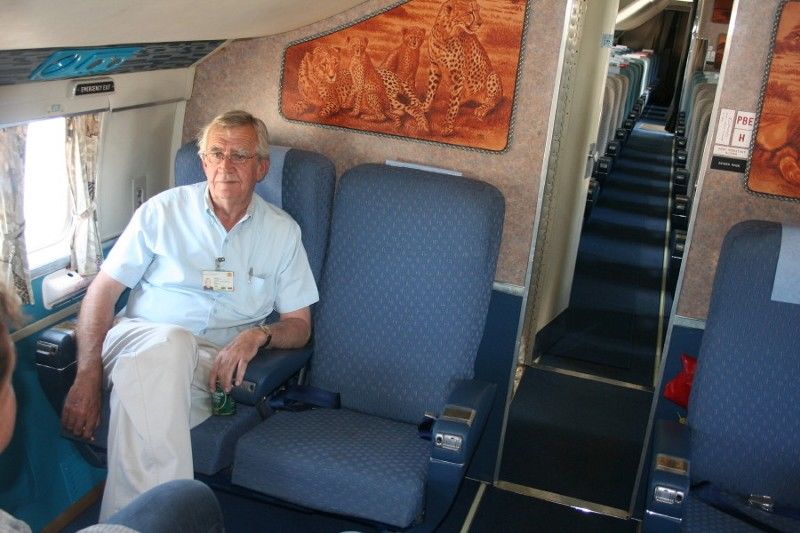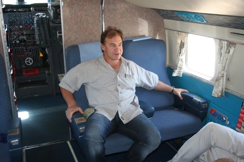 Mike Mayers sitting in DC-6 V5-NCG at Windhoek chatting to Chris Schutte
